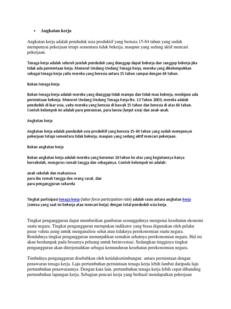 Kelompok ini biasa disebut dengan pengagguran terbuka (open employment). Jan 27, 2021 · tahun angkatan: Penduduk yang termasuk bukan angkatan kerja adalah penduduk usia kerja (15 tahun dan lebih) yang masih sekolah, mengurus rumah tangga atau melaksanakan kegiatan lainnya selain. Penduduk yang termasuk angkatan kerja adalah penduduk usia kerja (15 tahun dan lebih) yang bekerja, ataupunya pekerjaan namun sementara tidak bekerja dan pengangguran. Jun 28, 2021 · pendekatan pemanfaatan angkatan kerja ;
